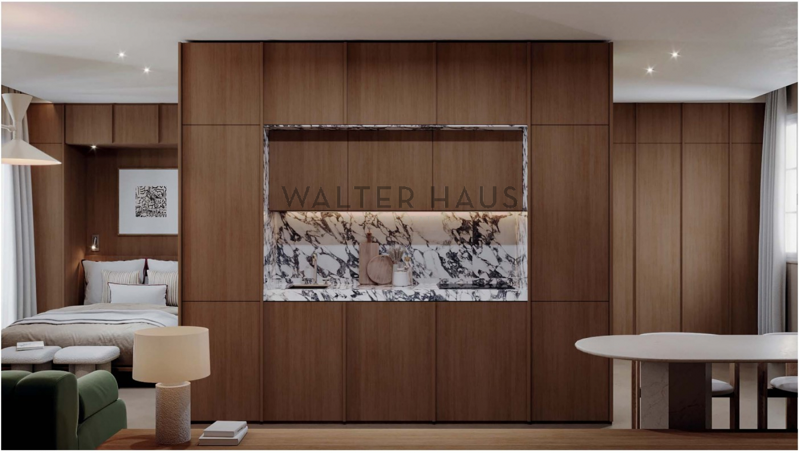 Un concepto de apartamentos convertibles dotados con un sistema de paneles correderos que permiten transformar un único espacio en un apartamento de dos dormitorios dobles en suite con camas ocultables en los armarios a medida que van de un extremo a otro del apartamento.