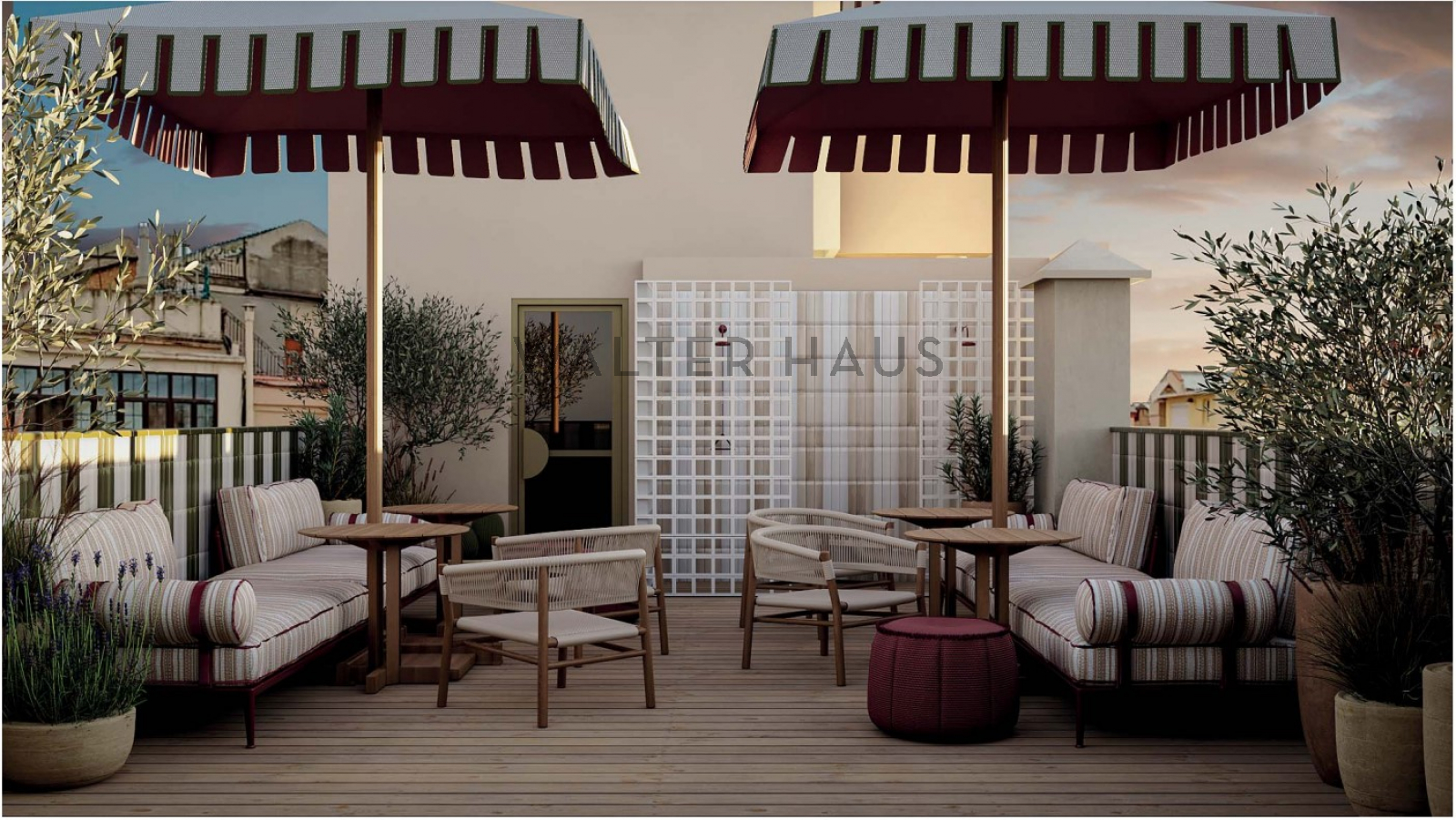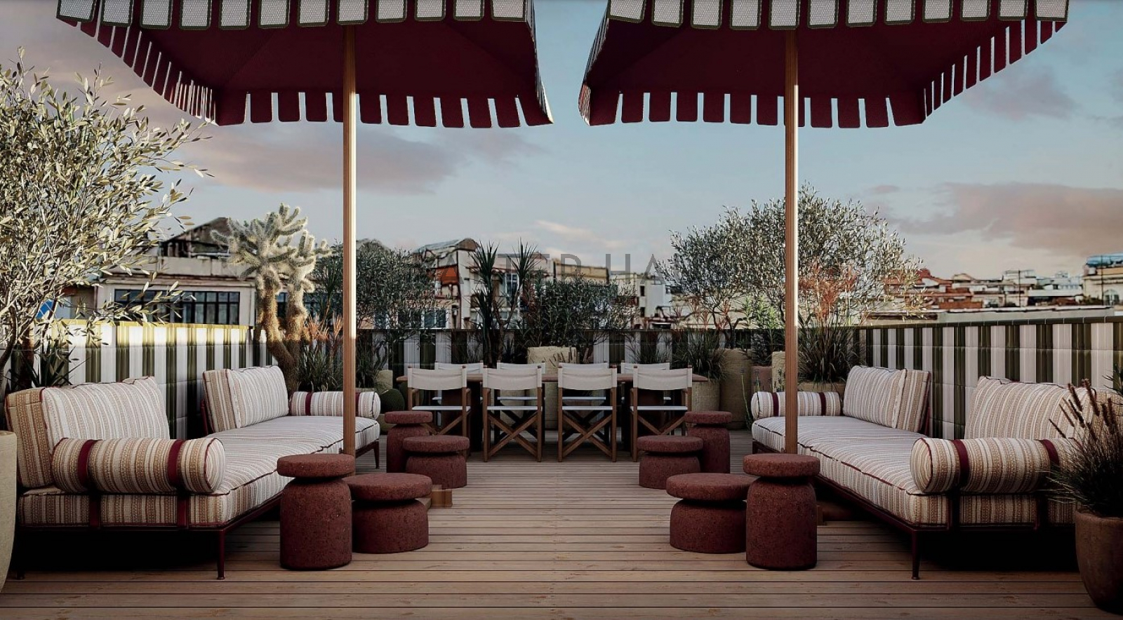 Todos los apartamentos disponen de salida a balcón y 5 de ellos cuentan con terrazas privadas de entre 10 y 50 metros cuadrados. El atico tiene terraza privada con vistas panorámicas a la ciudad de Barcelona desde donde se aprecia la Sagrada Familia.