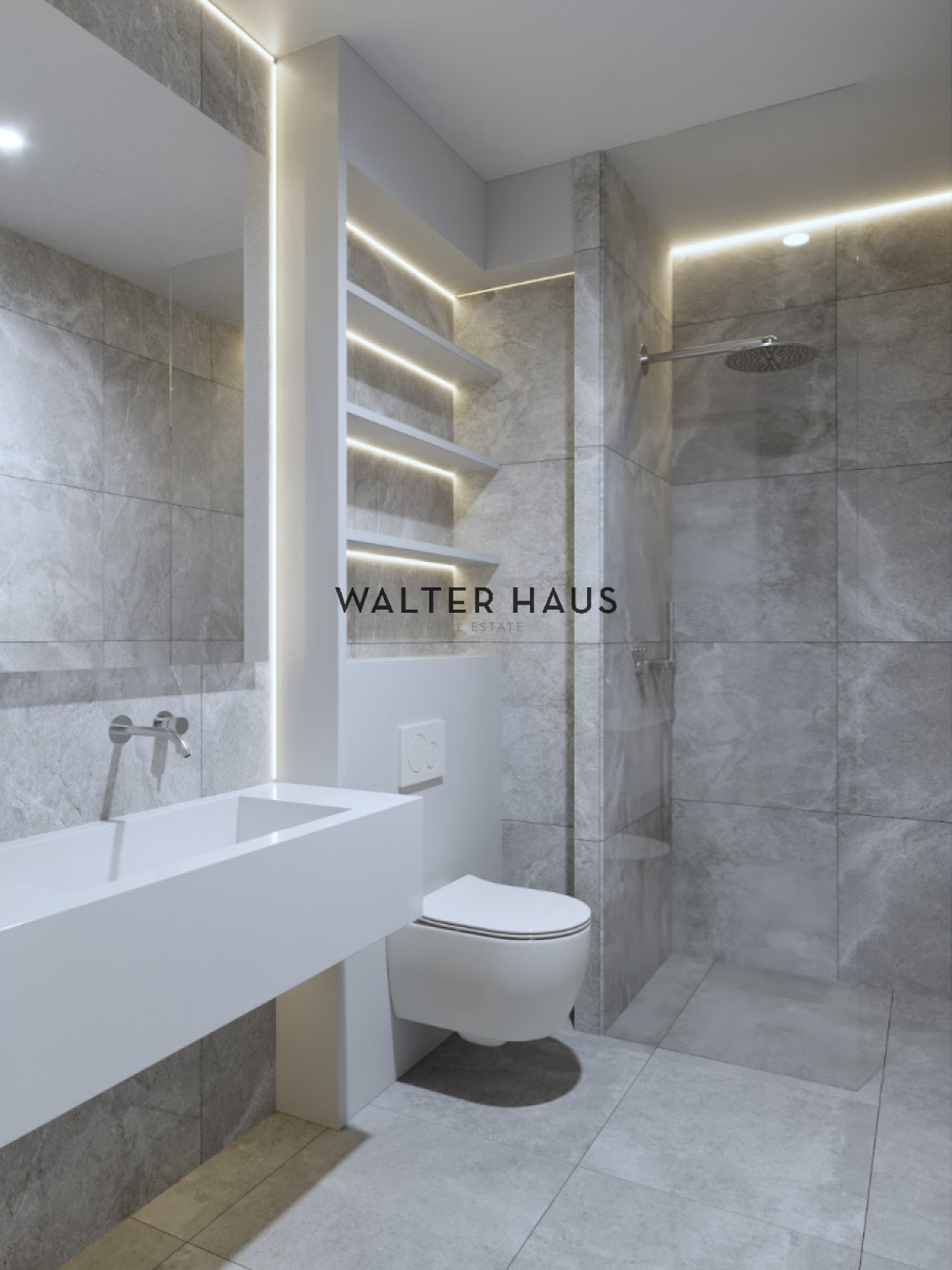 • Baños acabados en porcelánico en tonos grises y blancos.
